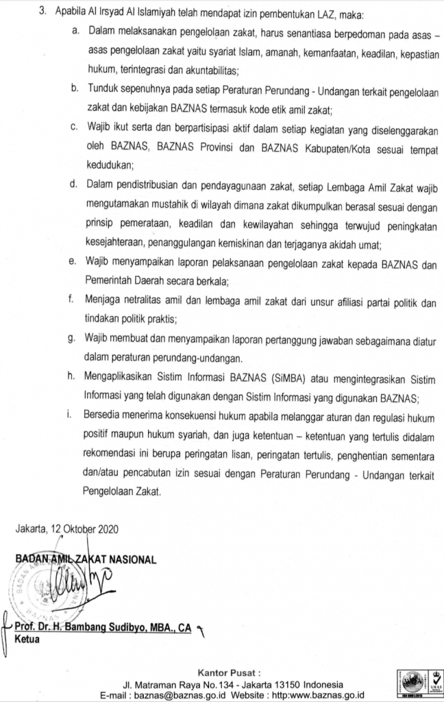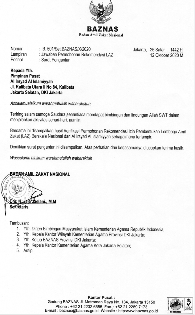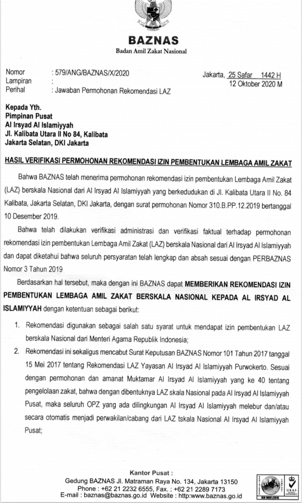Jakarta – Alhamdulillah, rekomendasi Baznas untuk Lembaga Amil Zakat (LAZ) tingkat nasional Al-Irsyad telah terbit. Senin, (12/10).
