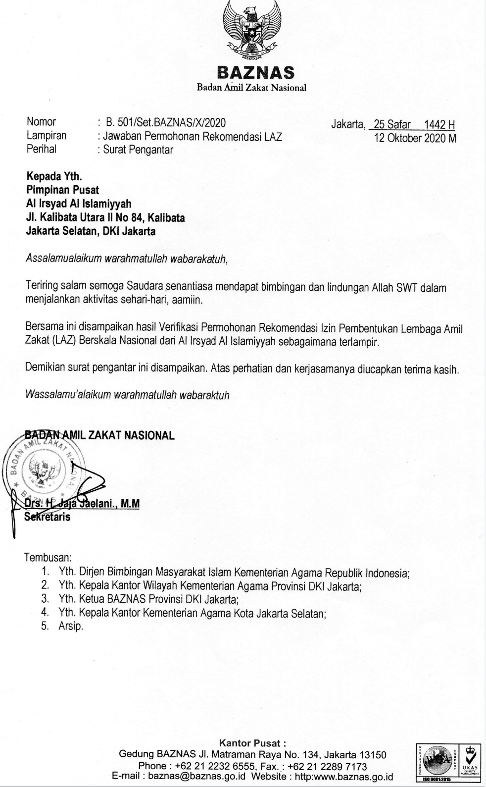 Jakarta – Alhamdulillah, rekomendasi Baznas untuk Lembaga Amil Zakat (LAZ) tingkat nasional Al-Irsyad telah terbit. Senin, (12/10).