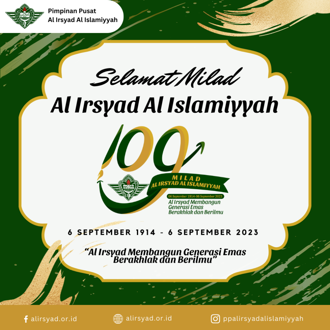 Pimpinan Pusat Milad Al Irsyad Al Islamiyyah ke-109 Penulis Alirsyad Alislamiyyah - 6 September 2023 200 Facebook Twitter Pinterest WhatsApp Selamat Milad Al Irsyad Al Islamiyyah ke-109 “Al Irsyad Membangun Generasi Emas Berakhlak dan Berilmu” 6 September 1914 – 6 September 2023