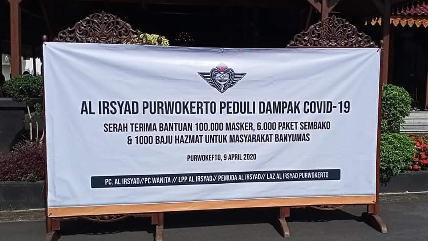 Purwokerto – Dalam rangka membantu pencegahan dan penanggulangan Wabah Virus Corona (Covid-19), Al-Irsyad Purwokerto serahkan bantuan 100.000 masker, 6.000 paket sembako, dan 1.000 baju hazmat untuk masyarakat Banyumas. Serah terima bantuan tersebut dilakukan di Pendopo Kabupaten Banyumas pada pagi hari ini. Kamis, (09/04/20).