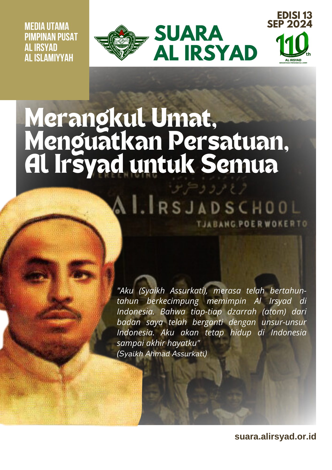 Alhamdulillah, Suara Al Irsyad (SAI) edisi ke-13 bulan September telah terbit. Pada edisi spesial kali ini, kami mengangkat berita dan informasi tentang kemeriahan peringatan Milad Al Irsyad ke-110 yang berlangsung di beberapa cabang. Selain laporan tentang kemeriahan Milad, kami juga menyajikan artikel-artikel yang insyaAllah, dapat memperkaya khazanah informasi dan pengetahuan kita bersama. Silahkan mengirimkan pertanyaan, naskah tulisan, dan saran melalui email ke suara@alirsyad.or.id.