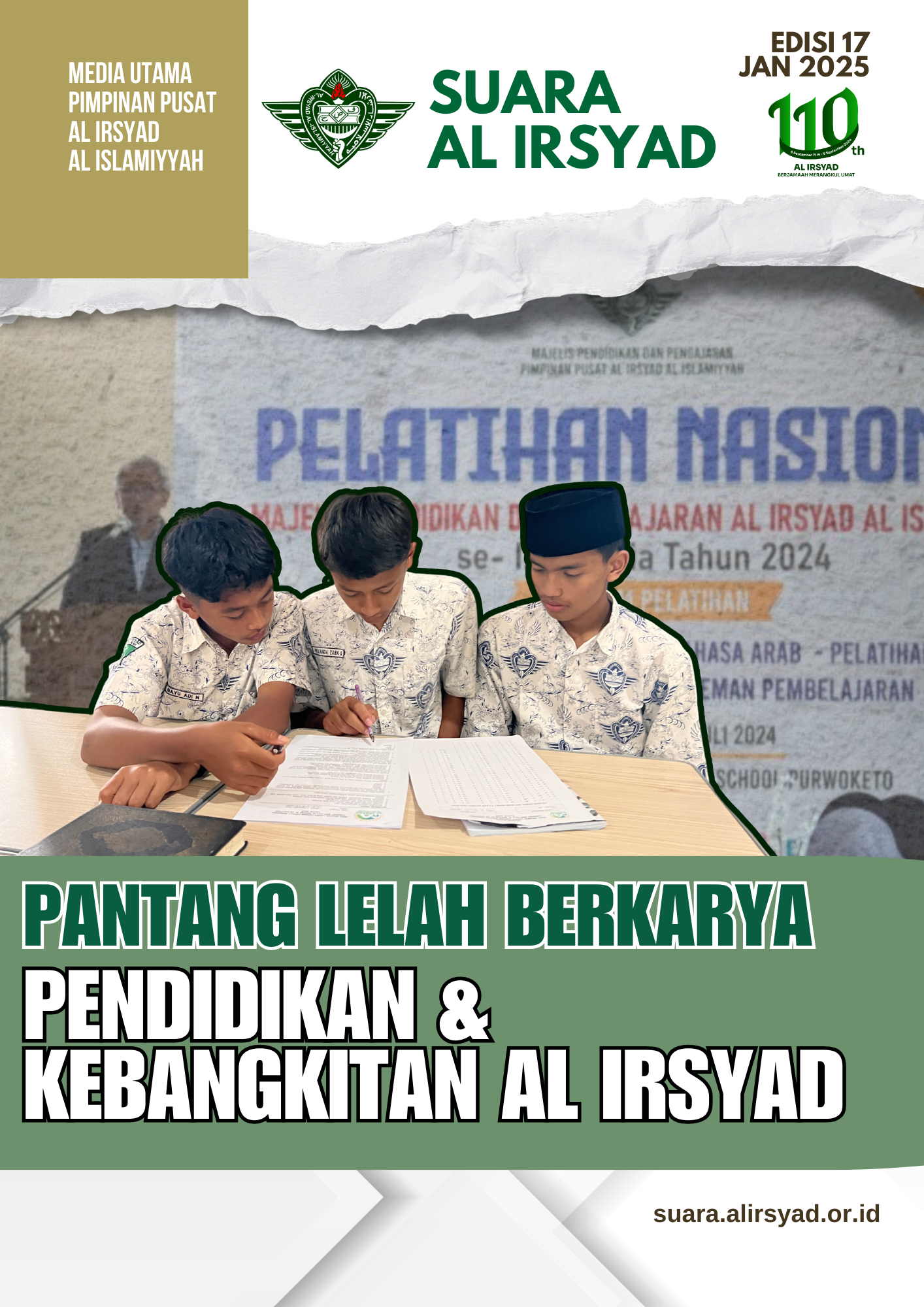 Alhamdulillah! Suara Al Irsyad Edisi ke-17, Januari 2025, telah terbit. Pada edisi kali ini, kami menghadirkan berita mengenai geliat pendidikan yang semakin semarak di berbagai cabang, disertai informasi menarik lainnya. Informasi yang kami sajikan dalam edisi ini mencakup prestasi siswa-siswi Al Irsyad, kegiatan dari LAZNAS, banom, dan majelis lainnya serta artikel bermanfaat yang insyaAllah dapat menambah wawasan kita.